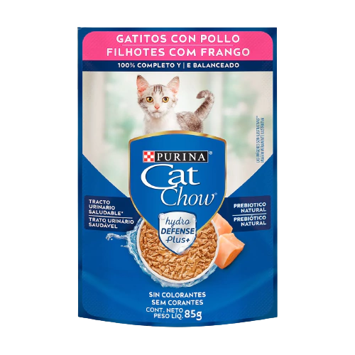 PURINA® CAT CHOW® Defense Hydro® Gatitos sabor pollo es un alimento húmedo completo y balanceado para gatos en crecimiento de 1 a 12 meses de edad de todas las razas.