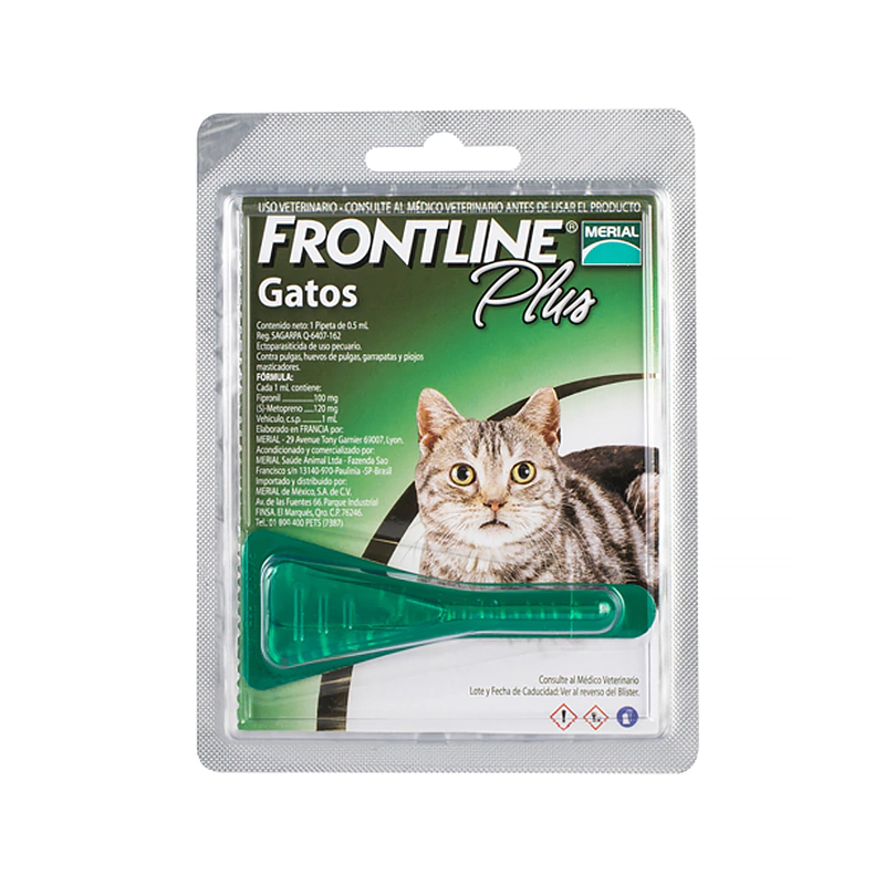 Anti pulgas y garrapatas para gato en pipeta Frontline Plus Protegé a tu gato y tu hogar con FRONTLINE® Plus, la solución avanzada que brinda una protección máxima y continua contra pulgas y garrapatas. Su fórmula exclusiva combina fipronil y (S)-metopreno para eliminar pulgas adultas y romper el ciclo de vida actuando también sobre huevos y larvas, evitando la reinfestación en el ambiente donde vive tu mascota.