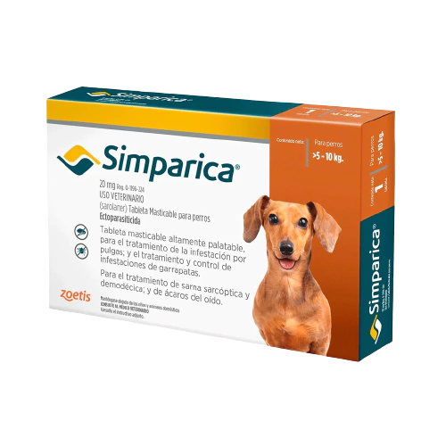 Simparica® es la solución innovadora y eficaz para mantener a tu perro libre de pulgas, garrapatas y sarnas durante 35 días consecutivos con una sola tableta masticable de excelente sabor. Diseñado especialmente para perros que pesan entre 5 y 10 kg, este comprimido ofrece protección rápida, segura y confiable.