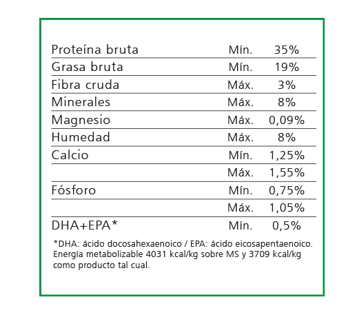 Harina de pavo, arroz, hidrolizado de hígado porcino deshidratado, aceite de pollo, huevo en polvo, cebada, arvejas secas, avena, pulpa de remolacha, coco deshidratado, aceite de pescado, aceite de coco, zapallo deshidratado, semillas de chía, sal, taurina, probióticos, extracto de manzanilla, jengibre en polvo, hinojo, extracto de romero, arándanos liofilizados (blueberries), arándanos rojos (cranberries), extractos vegetales naturales (té verde), aceite de raya, fructooligosacáridos. Vitaminas: A, C, D3, E, B1, B2, B6, B12, biotina, ácido fólico, niacina, ácido pantoténico, cloruro de colina. Minerales: hierro, cobre, zinc, selenio, manganeso, yodo, calcio.